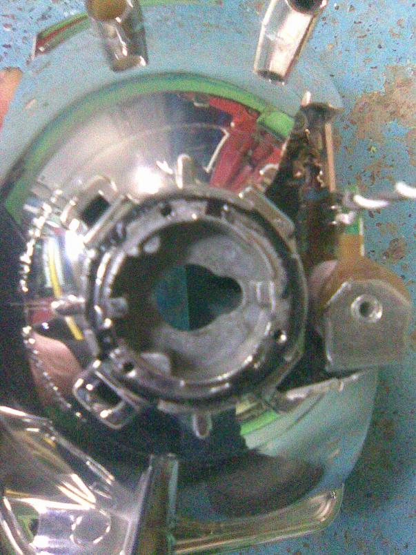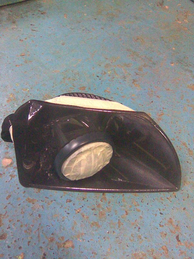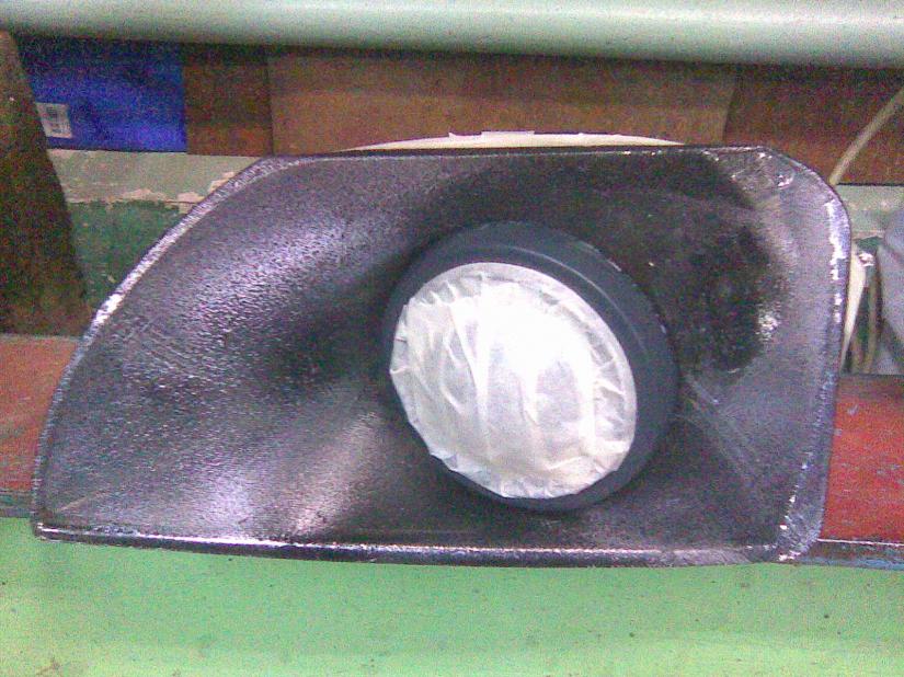 На пластиковом кольце линзы сверлим отв. 1,5мм через 1см., натягиваем на него трикотажи прошиваем нитками через отв. по периметру, вырезаем серединку, ставим на линзуи натягиваем на отражатель, закрепляем скотчем, пропитываем ткань смолой, сушим. Проклеиваем сверху два слоя стеклоткани и снова сушим. Далее шпатлюем, шкурим, грунтуем и красим.