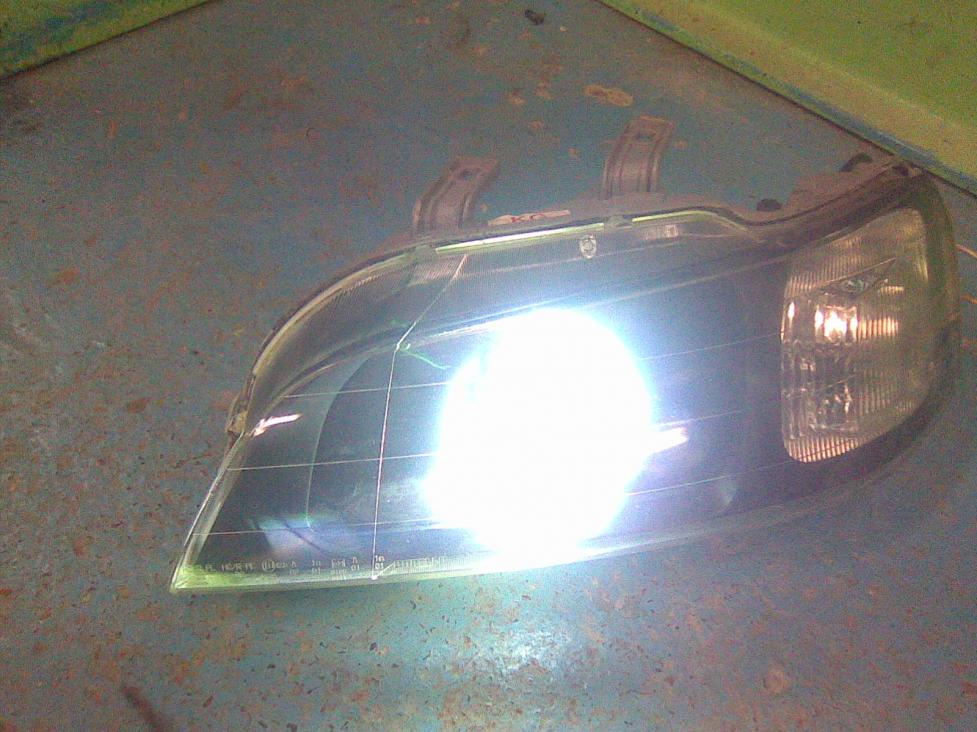 Отстгиваем основной отражатель от корпуса и акуратно балгаркой и дримелем пилим его под линзу(он очень хрупкий). Ставим корпус фары на машину(причем вторая фара не разобраная должна стоять на машине), подключаем лампу и юстируем(регулируем) линзу в пределахрегулировок отражателя по второй фаре на стене. Закрепляем линзу на свое усмотрение( я ставил на мебельные уголки 10х10мм.) учитывая чтоб она не задевала стекло фары при его установке, снимаем отражательс закрепленой линзой