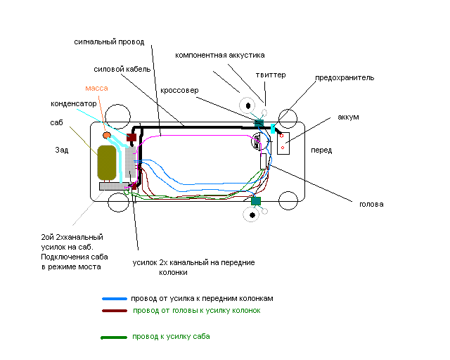 Решил прокладывать кабеля по всем правилам. От головы в багажник (к усилку). И от него на передние колонки (компонентка) и на саб.