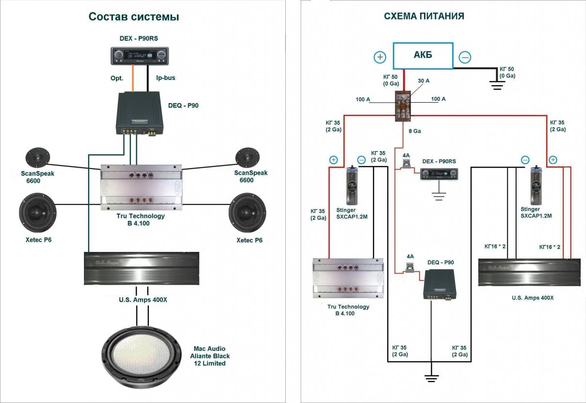 Состав системы такой: ГУ Pioneer DEX-P90RS+проц. DEQ p90, пищ. ScanSpeak 6600, мид. Xetec P6, усь на фронт Tru Technology B4.100, саб. Mac Audio Aliante ltd., усь US Amps 400X, провода сила КГ 35 на каждый усь, с акустическими проводами как то так: Kimber 4TC на пищ., 8VS на мид и на саб, межблоки cardas neutral reference. (удалось очень удачно купить метражом и сам распаял)