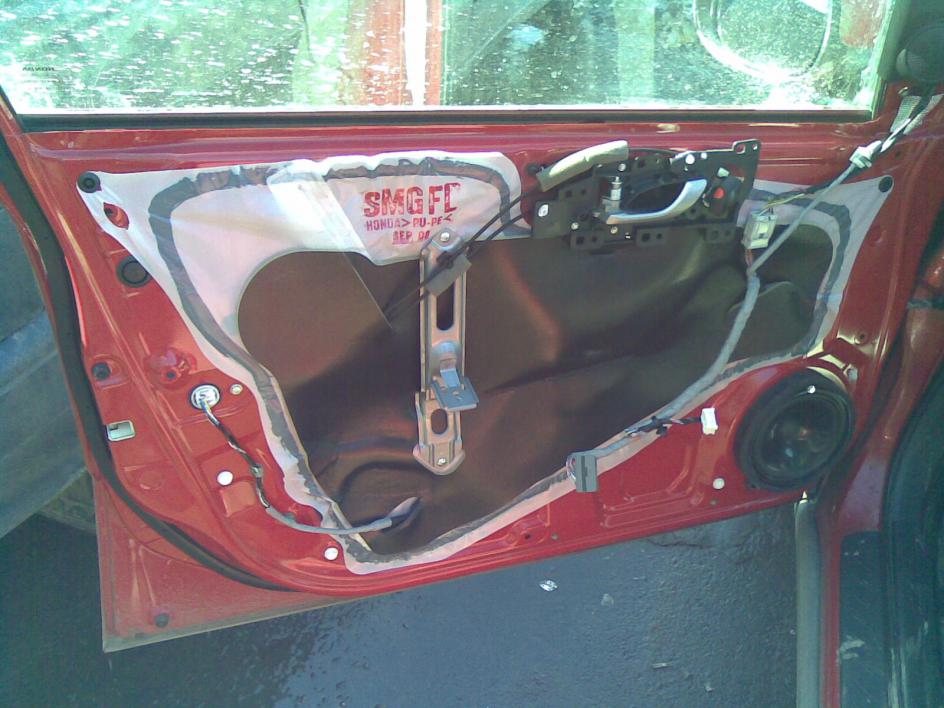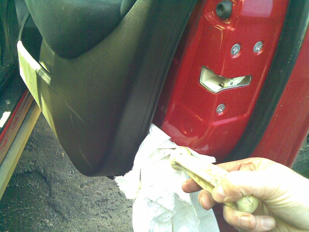 4) внутри обшивки тебе необходимо будет открутить 6 (на виду 8, но два откручивать не надо) саморезов держащих механизм открывания двери. как их открутишь, аккуратно выдавливай снаружи весь механизм из обшивки! за счёт чего она там держится, я не понял. поэтому и говорю - аккуратно, но упорно))) со всех сторон по чуть-чуть. должно после щелчка выскочить.