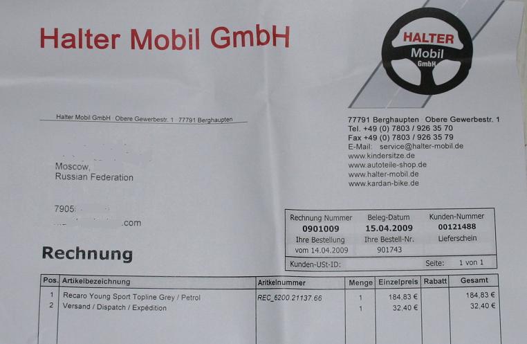 Мне сегодня прислали кресло из Германии. Пришло в рекордные сроки: менее недели. 14.04.09 заказал, а 21.04.09 получил на почте. В подтверждение своих слов выкладываю инвойс из коробки: