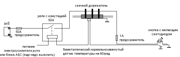igor2009, Понятно! Значит датчик висит на первом фитинге перед первой свечей не важно как прилеплен и когда железный фитинг нагревается до 60 градусов цепь размыкается светодиод на кнопке гаснет подогрев не работает? А почему ты хочешь мигающий светодиод а не просто горящий?