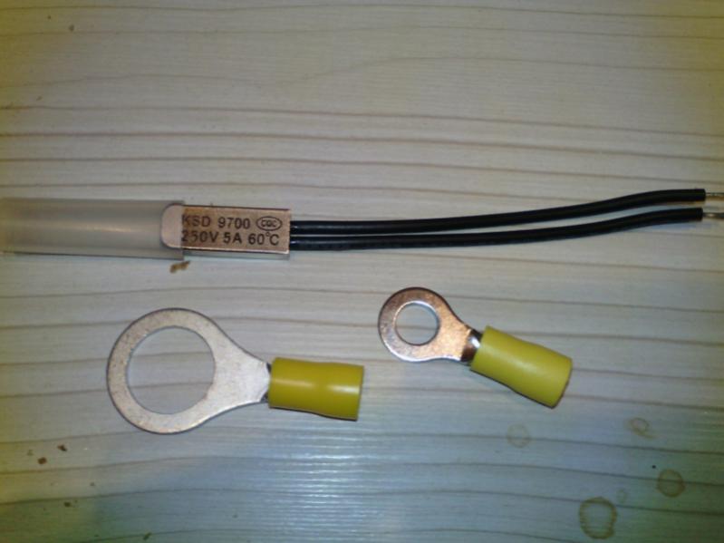 Обзавёлся температурным выключателем. Протестировал его: размыкает цепь при 60-61 градусе, замыкает обратно при 50. То что нужно короче. Единственное, у датчика один из выводов замкнут на корпус, а значит цеплять его надо к шлангу, либо к металлу но через силиконовый чехольчик идущий в комплекте, а это значит что срабатывать он будет при 65-68 градусах примерно, если я правильно измерил (хотя я посмотрел это 5 кубик на приборке - в полне нормально, а то если отключать реально при 60 то это всего второй кубик)