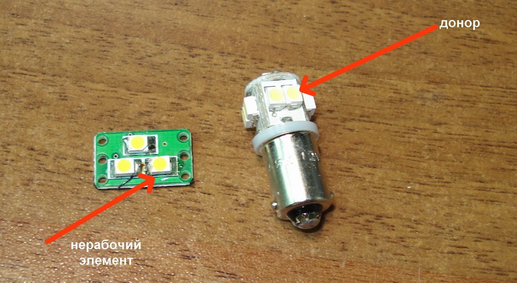 5. удаляем перегоревший элемент подсветки. перепаиваем светящийся элемент с "донора".