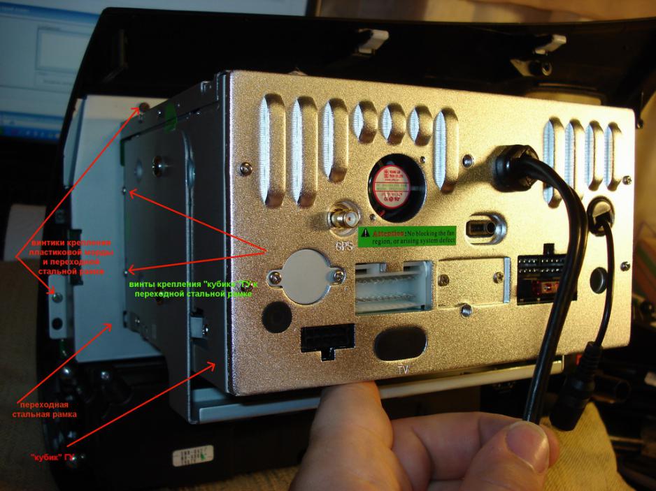 3. Сразу после вскрытия транспортной упаковки были обнаружены «лишние» маленькие винтики саморезы. Так вот с ними морока оказалась уже не такая простая… ГУ было установлено. Позже пресловутая китайская сборка таки проявилась. Как потом оказалось - это были винты крепления переходной стальной рамки, которая соединяет собственно стальной корпус ГУ (кубик) и пластиковую морду ГУ – нашу красивую панель музыки с климатом. Сам кубик крепится к этой рамке посредством 4 винтов, а рамка в свою очередь 5-ю саморезами к пластиковой «морде». Саморезы вкручены в пластиковые «столбики». После месяца эксплуатации рамка отвалилась от пластиковой морды, все пять саморезов вывалились, пластиковые столбики растрескались и частично осыпались. Фактически «кубик» ГУ отделился от лицевой панели и был связан с ней только шлейфами. Просто в пространстве торпедо ему некуда было падать. После снятия ГУ (для ремонта CD привода) пришлось разбирать все на блоки, прикручивать стальную рамку более длинными винтами – хорошо, что глубина позволила – и собирать обратно. Попутно было устранено куча косяков по сборке - докручены нехватающие винтики, затянуты недокрученные, ровно проложены шлейфы и провода и прочие мелочи.