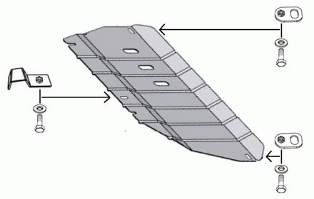 Защита только передними болтами привернута к кузову (точнее буксировачным кольцам), а задний болт крепится к прижиму (пластина загнутая крюком). У оригинальной защиты оба задних болта тоже с прижимами.