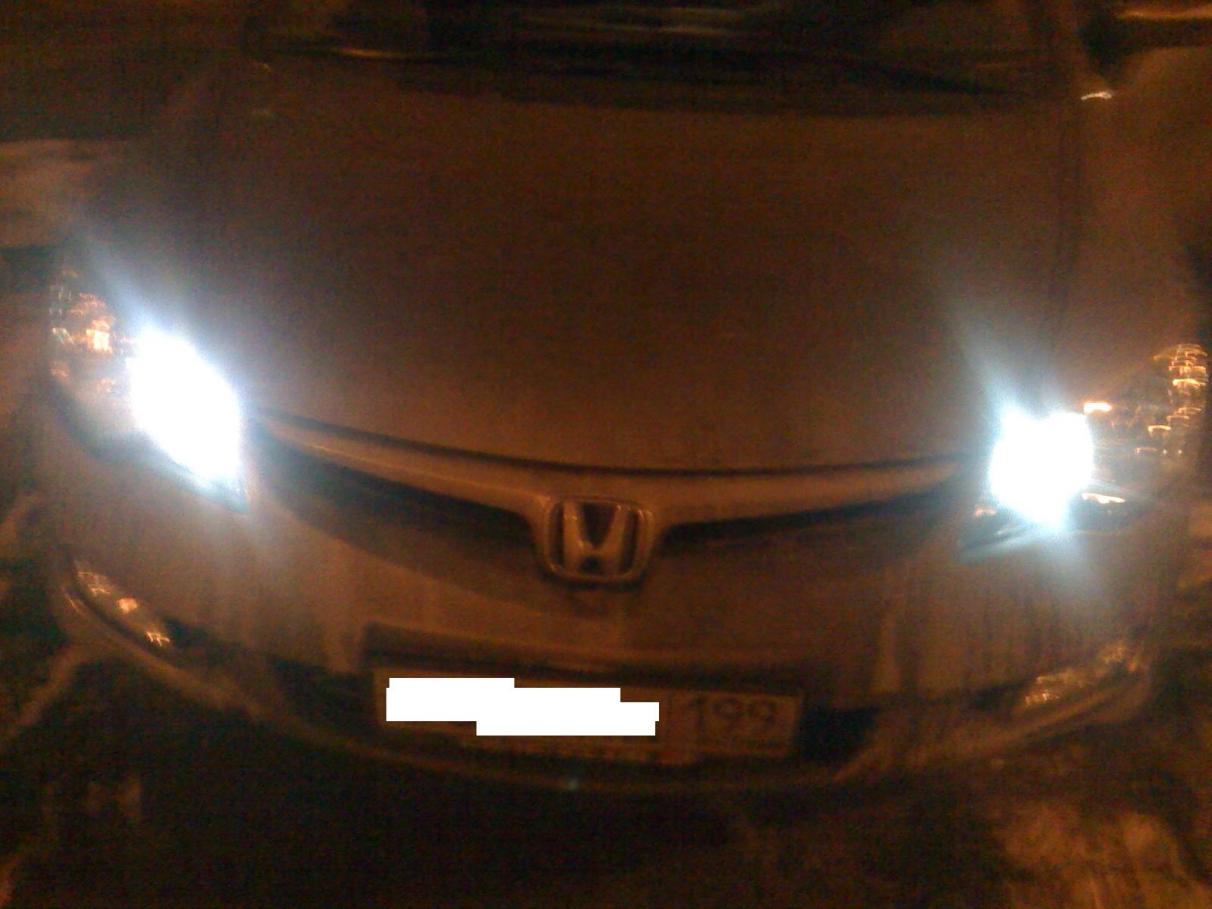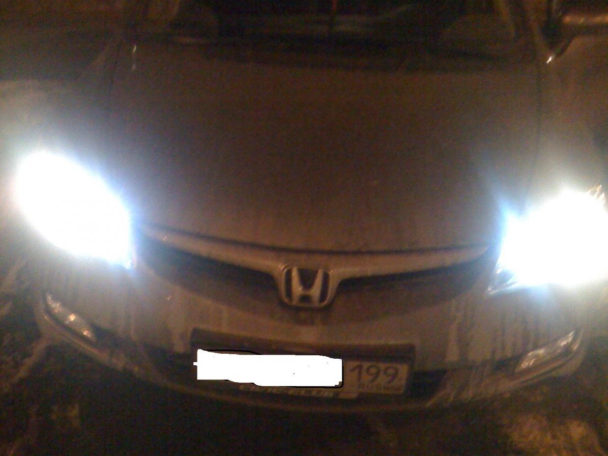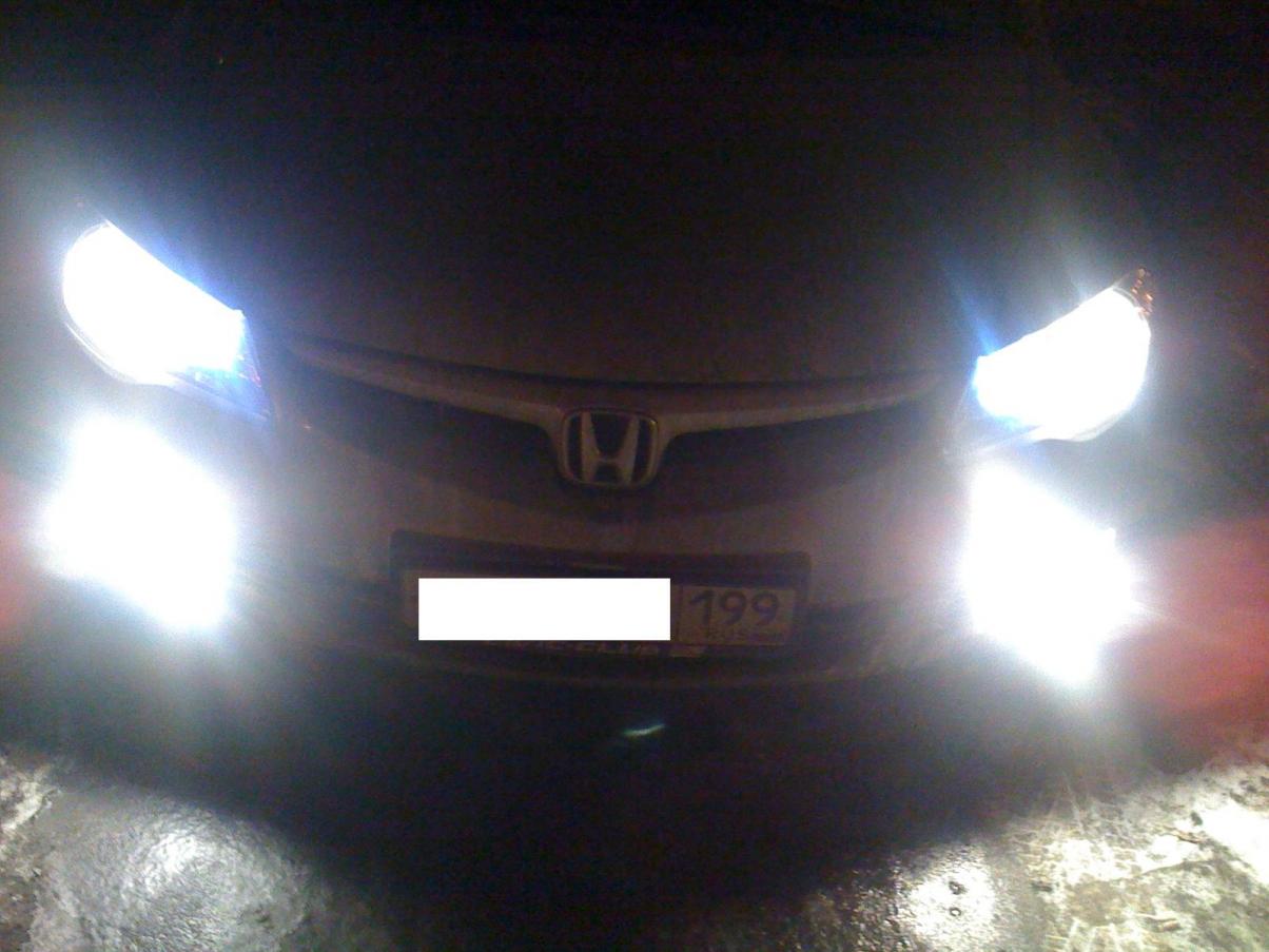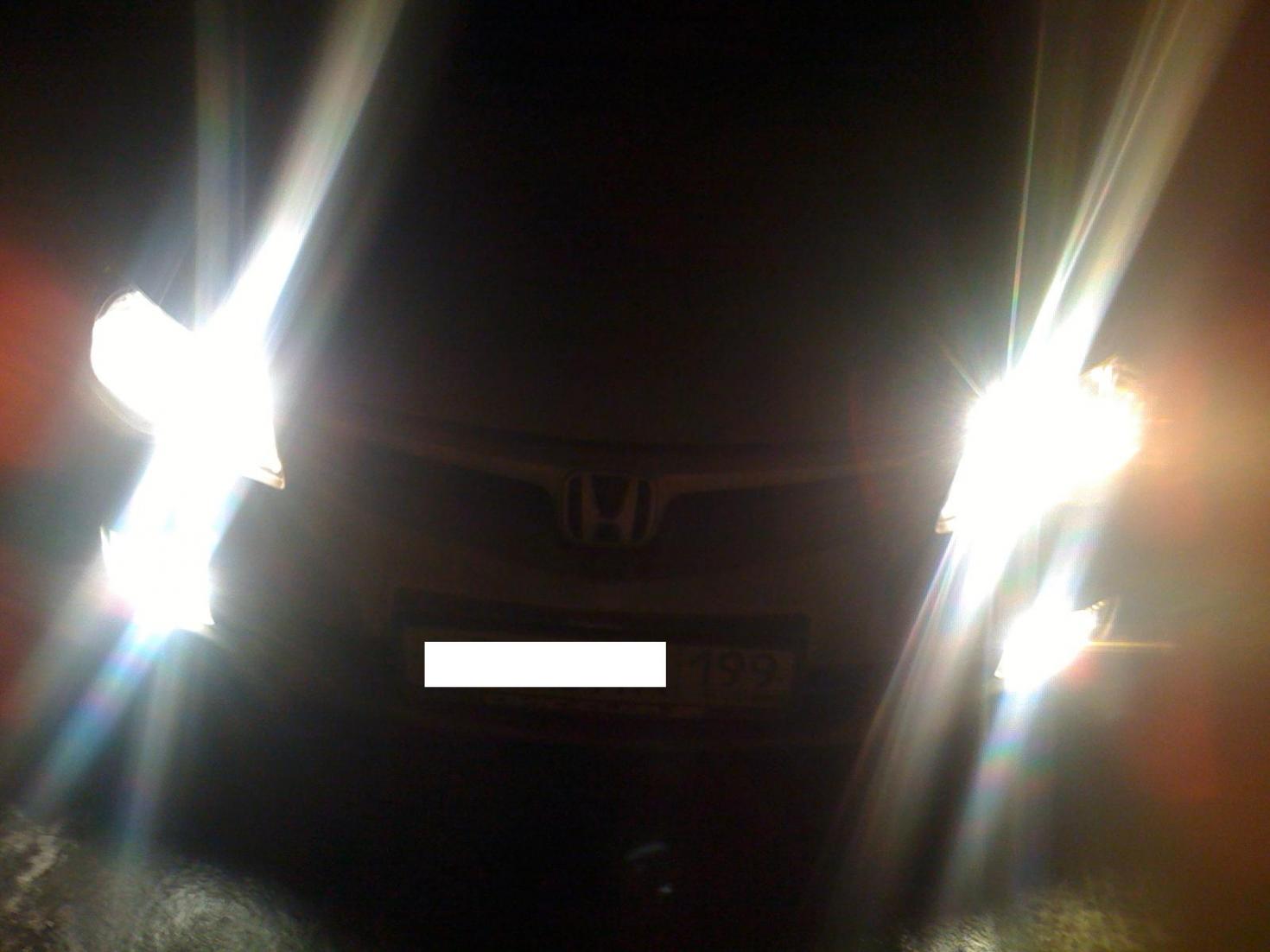 Снимал на телефон, фото понятно что не очень, но цель была показать цвет ламп, а диоды стоят российского производства на а/рынке за 300руб./пара взял, подбирал по цвету, но в фаре синевой отдают, когда пробывал без фары был белый цвет. Ближний больше белый чем синий. В одном корпусе по 4 маленьких диода стоят. Сфотаю как освещают дорогу, потом выложу.