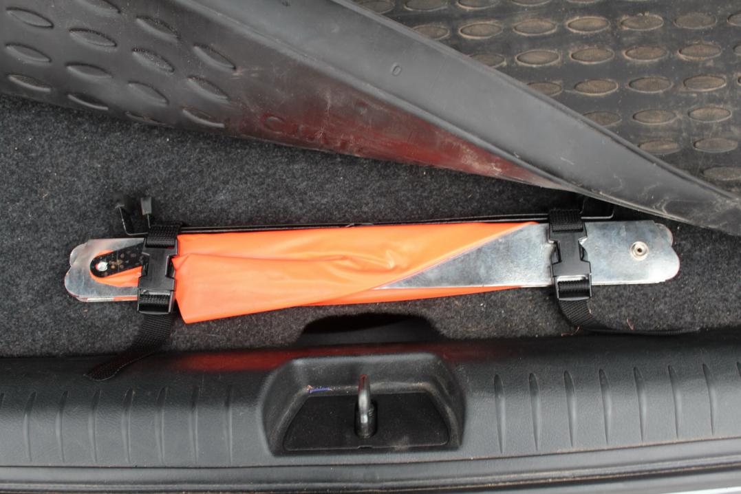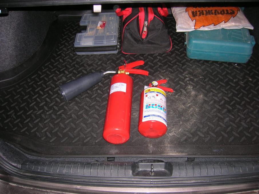Купил в магазине "Би-Би" раскладную матерчатую сумку с несколькими отсеками, все фиксаторы на липучках. Площадь её опоры видимо достаточна чтобы не переварачиваться, ниразу такого не было. Там всё, перчатки, замшевая тряпка в чехле, мануалы по машине, атлас, комплект для прикуривателя, компрессор, трос, концентрат омывайки, полероль, щётки и чемоанчик с набором пстонов, лампочки и прочая мелочь, даже пестик воздушный с мишенями и пульками, но, огнетушитель у меня справа в нише на пенопласте. Вещь необходимая, и не дай бог что, а огнетушитель в запаске, а ты едешь к Тёще в Воронеж, то и достать его не успеешь. Посему и возник вопрос, может кто в салон примостил огнетушитель? А цена вопроса такой сумки что-то в районе двухсот рублей, уже не помню. Стоит в дальнем углу багажника. Треугольник зажат ремешками с карабинами, на фанерной полке прикрывающей запаску. У меня там изначально эти ремешки были.