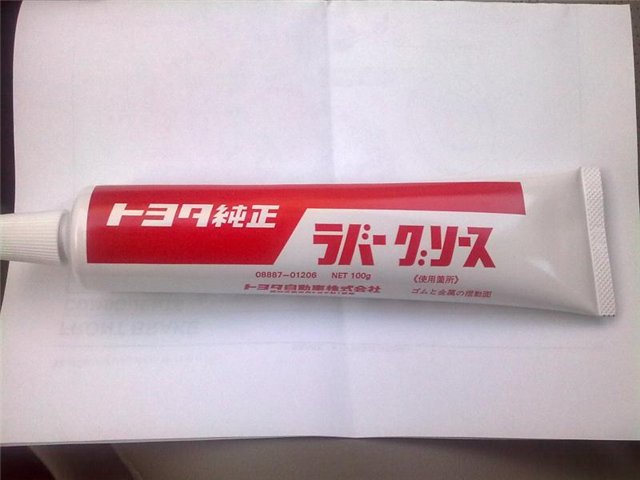 Тоже смазал под пыльником рабочего цилиндра, вот этой смазкой 08887-01206. Это rubber grease, то есть смазка для резиновых деталей. также впрыскиваю ее шприцем под пыльник поршня в суппорте, чтобы они легко ходили и не закисали.
