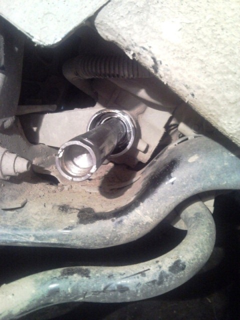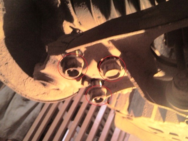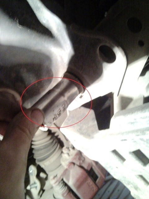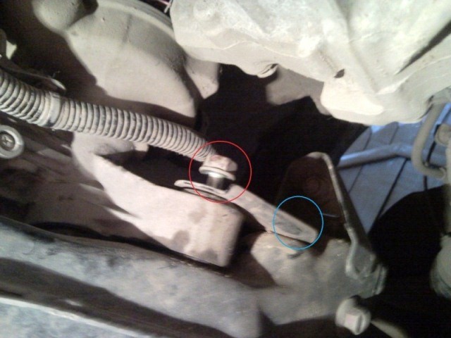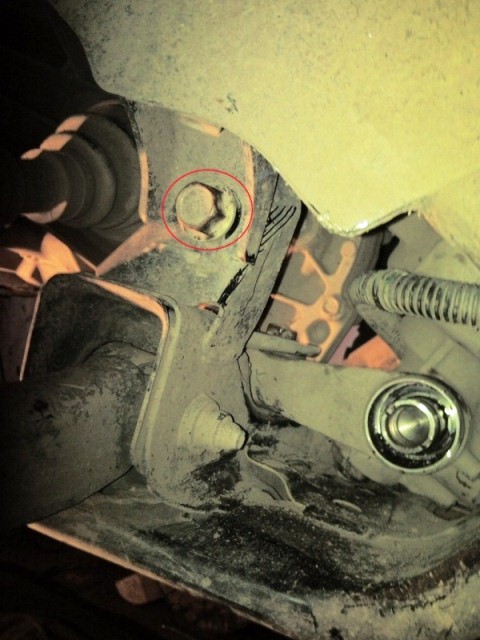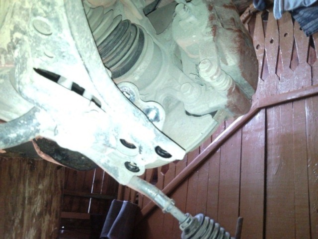 Открутил с обоих сторон 2 гайки и 1 болт крепления шаровой опоры (чтобы отсоединить подрамник от стоек)