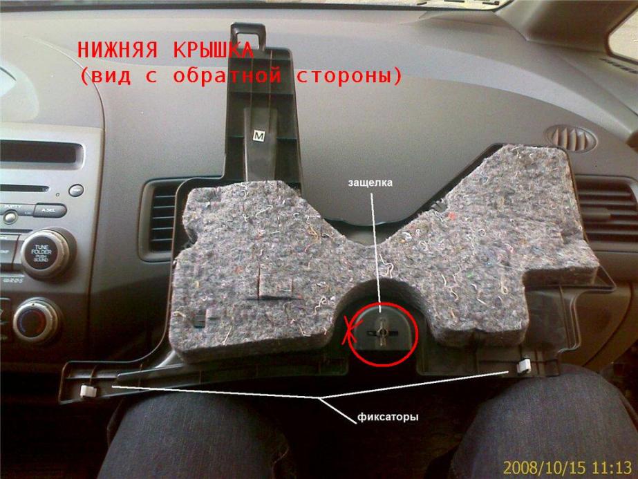 Сразу панель не снимешь; нужно снять чёрную крышку у педалей внизу, далее, чуть выше серую панель (с карманом которая). Отсоединяешь кнопки VSA, регулировок (нажимаешь на лепесток на штеккере, почувствуешь и тянешь); потом откручиваешь винт слева снизу и тянешь на себя козырёк спидометра (начинать слева около воздуховода)... потом, так же на себя голову с магнитолой (начиная слева сверху). Аккуратно без рывков, с постоянным усилием без каких-нибудь отвёрток....Фотки позаимствованы у Srg63 отсюда.