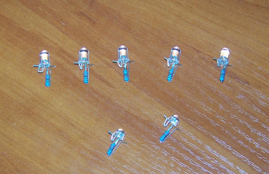 Для работы от бортовой сети ~14В, необходимы резисторы 1,3-1,5 кОм, но так как яркость светодиодов мне показалась излишней, я использовал резисторы 2,2 кОм.