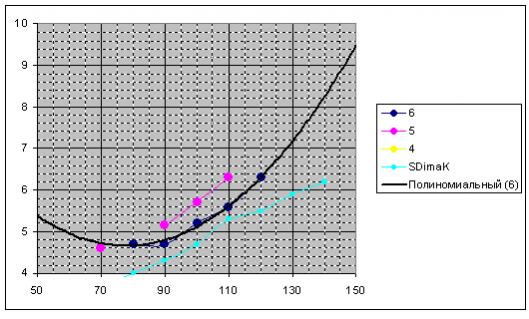 Мой расход по компу примерно на 0,5 л больше твоего (кстати, комп занижает расход по моим замерам на длинных дистанциях на ~11%) и быстрее растет с ростом скорости. Может потому, что машина почти нулевая, не обкатанная. А может, круиз сильно лучше дрожащей ноги. Хочу однако заметить, что мои кривые от скорости чуть лучше соответствуют теории (у тебя расход растет даже медленнее скорости, а должен расти в степени от 1 до 2). Надо бы тебе повторить замеры на больших скоростях, что-то тут не так... Что за отрезок КАД? У нас на юге (от вантуза до СЗД) горок уж больно много, да и народ суетится. Лучше бы без уклонов и в одиночестве. Мой мерный участок на объездной вокруг Новгорода (не на Москву, а с другой стороны, на Лугу-Шимск). Там болотина вокруг и местность плоская, как блин. Расход стабилизируется уже через пару километров, даже 15-ти на замер не надо, хватает и 5-ти.