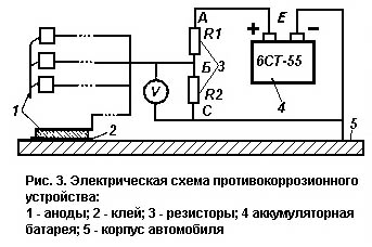 К точке 1 делителя необходимо припаять длинные провода (в изоляции), к другим кониам которых припаять стальные пластины—аноды. Каждый анод представляет собой пластину из низкоуглеродистой стали прямоугольной формы размерами примерно 2x2 см. Для защиты можно использовать и внешние аноды, о чем будет сказано далее. Предлагаемое устройство превращает корпус автомобиля в катод, который в процессе эксплуатации будет восстанавливаться за счет окисления анодов.