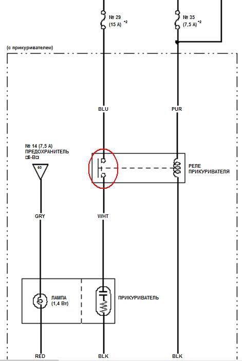В общем, что я хотел сказать по этому поводу: у самого было похожее - тыкал зарядник для сотового и чёй-то машине не понравилось и после этого прикуриватель перестал работать... пробовал смотреть предохранитель, оказался целый. На следующий день заработало всё само. Судя по схемке, наверное плохой контакт был в реле (отмечено красным) при включении ключом в АСС, хотя очень сомневаюсь, но чему ещё быть ??? Воть......![]()