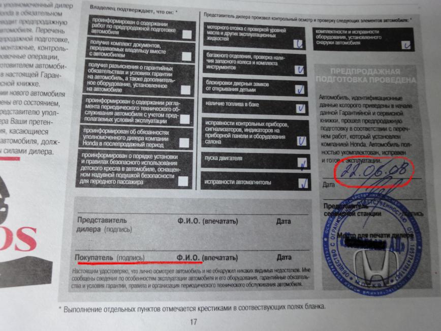 часть первая: Машину я покупал в 2008 году( середина августа), прям перед кризисом, надеюсь помнят люди, что тогда время ожидания машинок составляла от трёх месяцев и до полугода. А машинку то очень хотелось сразу и даже не жалко было денег переплатить за нее. Открыл Авто.ру и начал поиск. Нашел, приехал посмотрел на машинку все устроило, все отлично! Естественно, что это был не официальный салон Хонды, на мои вопросы про гарантию ответили, что мол вот вам именная сервисная книжка и гарантия три года или сто тысяч, книжка не заполненная до сих пор(фото прикладываю ниже). Единственную запись я там нашел о "предпродажной подготовке". Да и то заполненную с нарушением. Есть ли правила заполнения такого рода документов и кто это должен делать???? Но к моему сожалению, эти вопросы пришли только сейчас а не тогда.