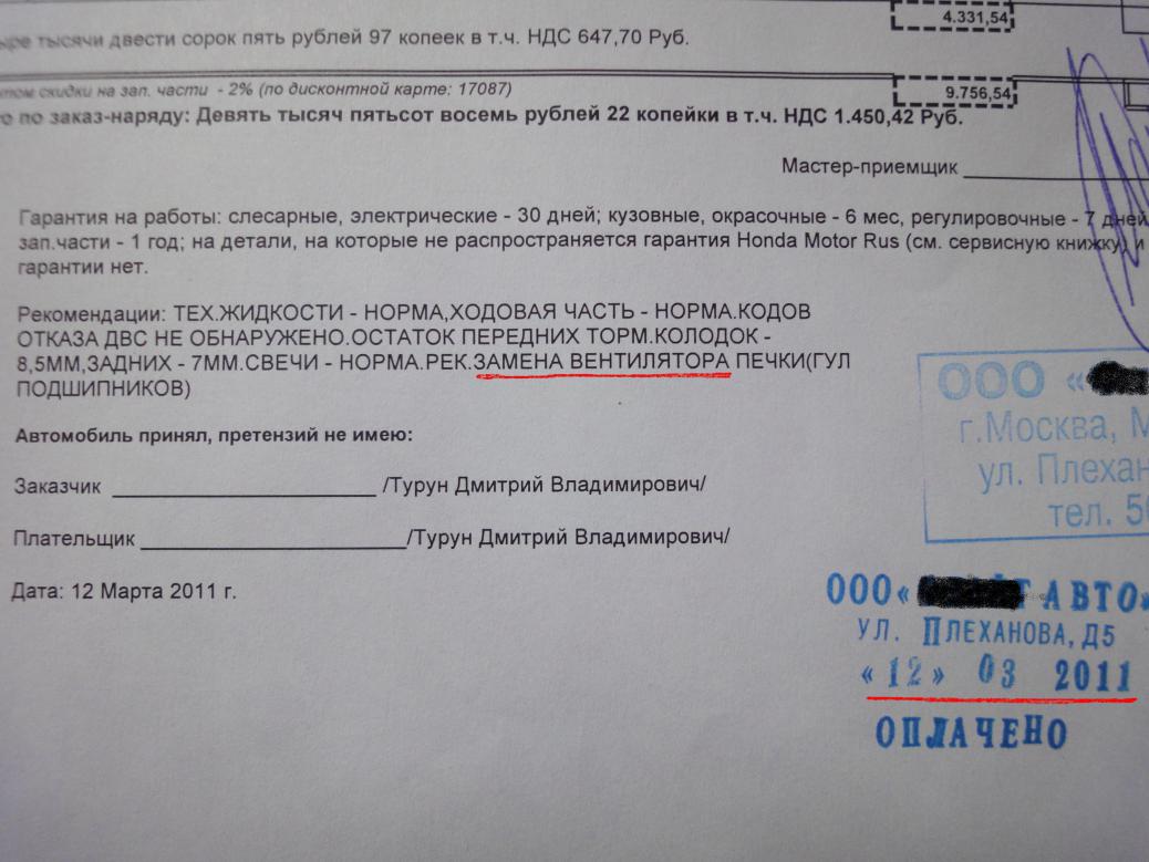 На последнем ТО 60 (оно было в Марте, фото ниже) меня начал беспокоить вентилятор печки, я про это все рассказал, мне сказали мол обращайся к менеджеру по гарантии и тебе все починят бесплатно, так как ты не первый. Потом у меня времени не было, плюс привык к печке(к гулу)) решил обратится все таки на замену. пришел в гости к оф.дилеру 02.06.11. И говорю, хочу на диагностику и замену, мне в ответ, что эту диагностику проводит только электрик, а он у них на вес золота(так как по их словам, что у них один в отпуске, а другой уволился. А это разве мои проблемы???) и в самый ранний срок по записи к нему аж на 03.07.11. Думаю, вот "контора", ну да ладно, все равно успеваю обратиться до конца гарантии. Сегодня прихожу в гости к ним и слышу ответ: " Дорогой друг, у тебя гарантия закончилась 26.06.11(оказывается у ХМР есть электронная база гарантийных сроков) и тебе ни чем не можем помочь, типа готовь 13 тыщ рублей и будет тебе счастье..." Получается, что в момент передачи от Оф.дилера к Юр.лицу и начал действовать срок гарантии, но нигде мне не было сказано про сроки и так далее..