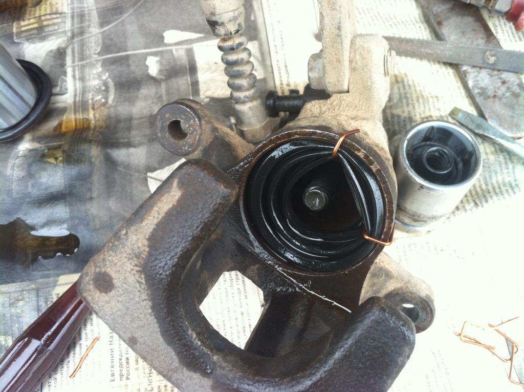 Я в экзисте заказал поршень за 1400р. и ремкомплект, теперь уже за 130р. и поехал в гараж менять. Разобрал и вижу, что новый за 1200р. пыльник они опять порвали, да еще сильнее. Расстроился блин, что никому доверять нельзя и заменил все сам. Сложность возникла с вставкой поршня в установленный пыльник. Пришлось смекалку включить. Может кому пригодятся такие хитрости. Обратите на фото внимание на шариковую ручку, которой я заглушил тормозной шланг и на проволочки, которыми я растянул внутреннее отверстие пыльника. Все успехов!.
