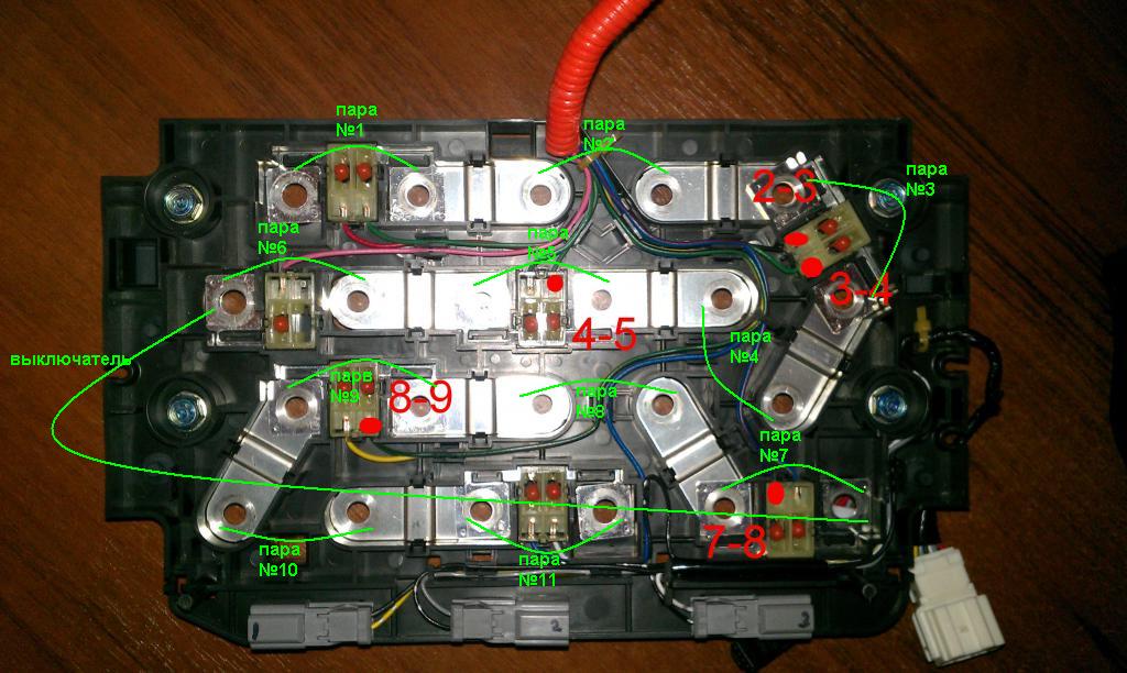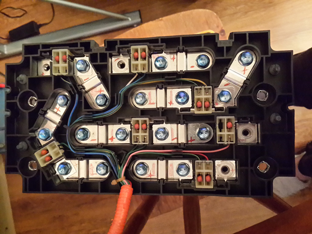 Там, где остались не болты, а дырки, можно померить между ближайшими дырками напряжение. Одно 90-100, второе 70-80. В сумме 160-180. Должно получиться напряжение одной пары, умноженное на 11.А вот как после сборки узнать правильно ли я собрал?