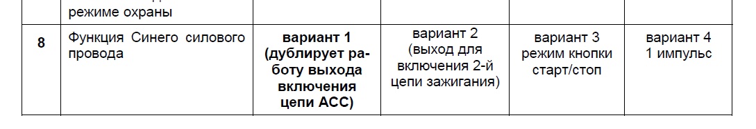 СИНИЙ провод: программируемый выход включения ACC, 2-й цепи зажигания, режима кнопки старт/стоп или отключения штатной сигнализации (иммобилайзера)