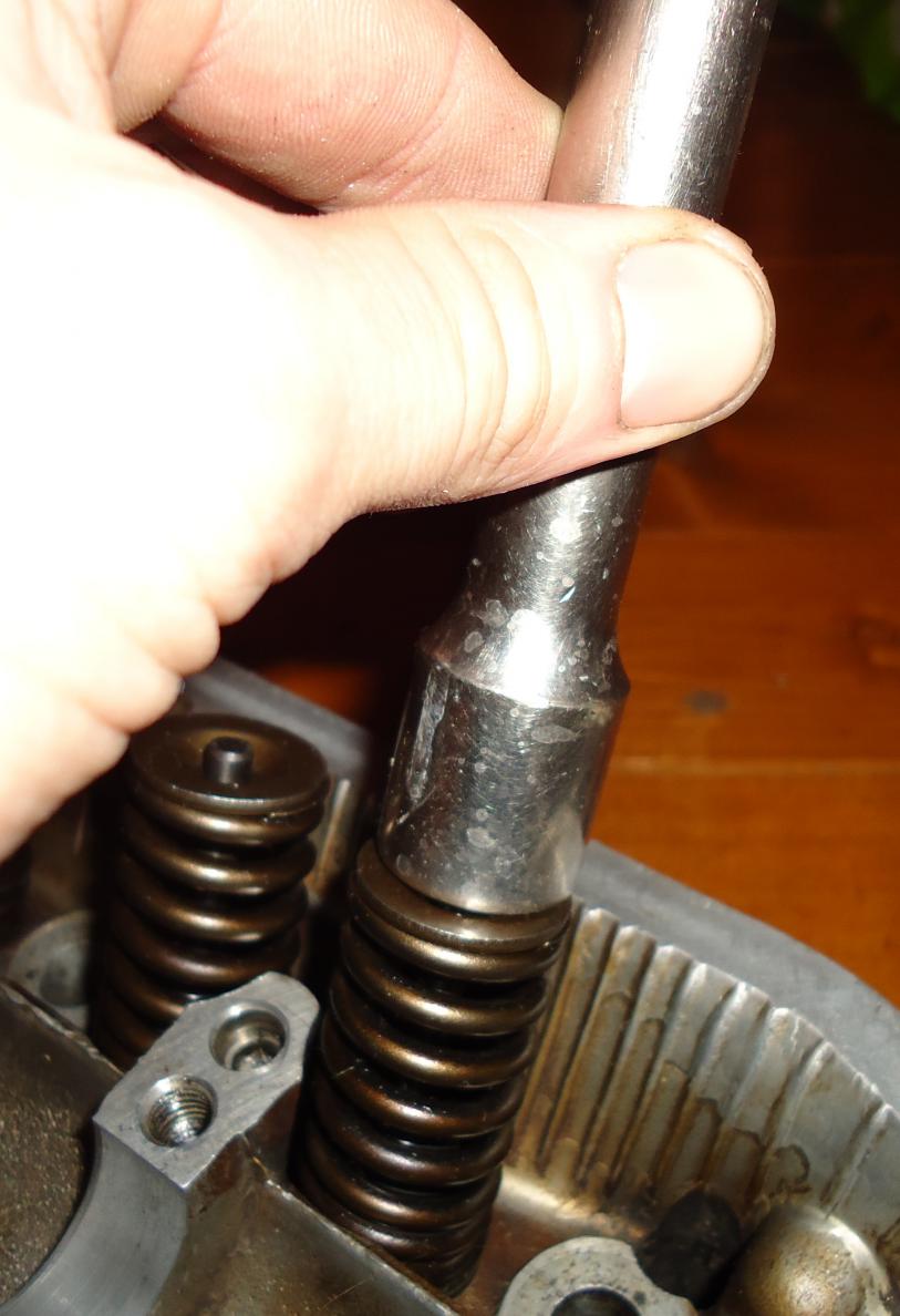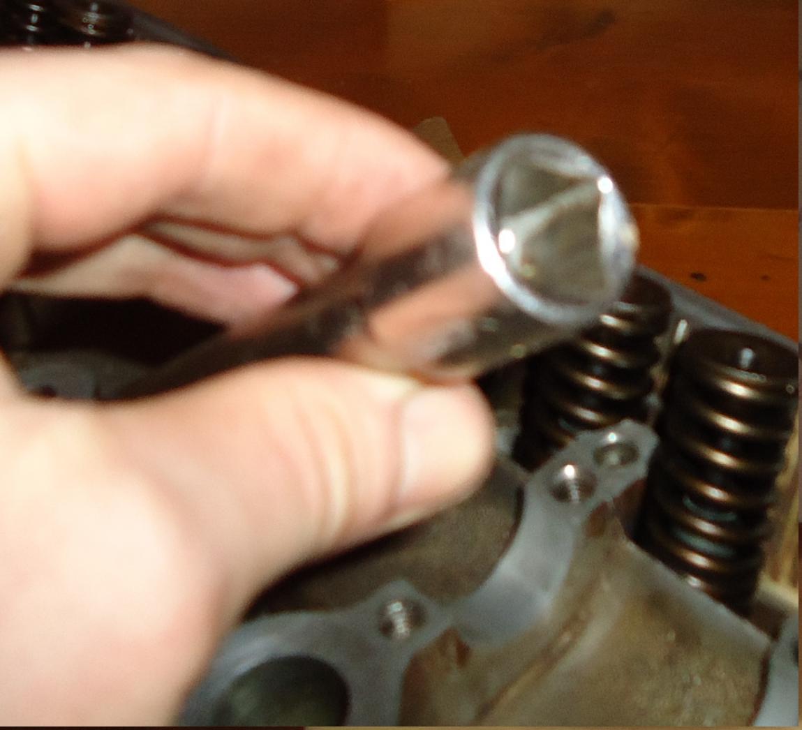 Рассухаривал клапана я с помощью маленького удлинителя от воротка и молотка, вот этой стороной удлинителя надо прикладывать к клапану