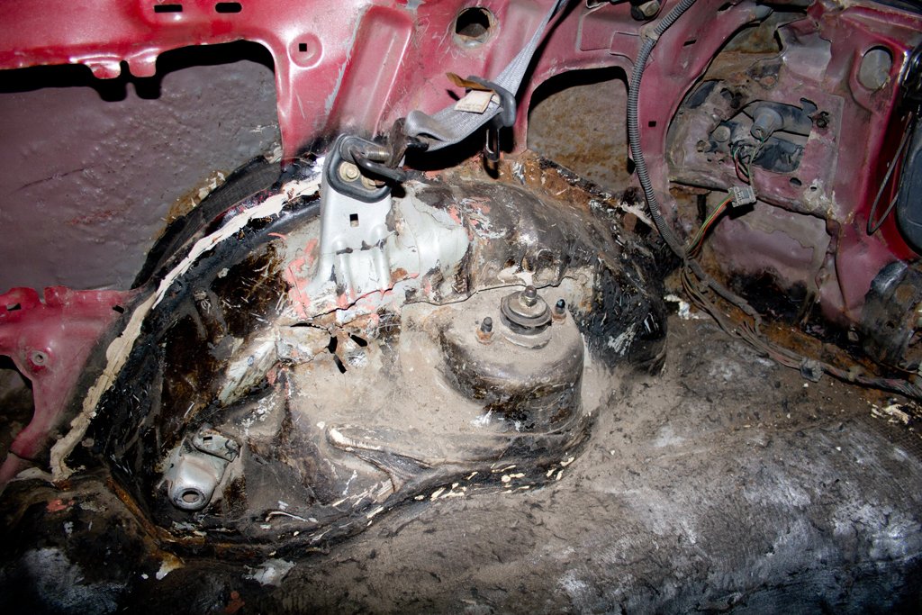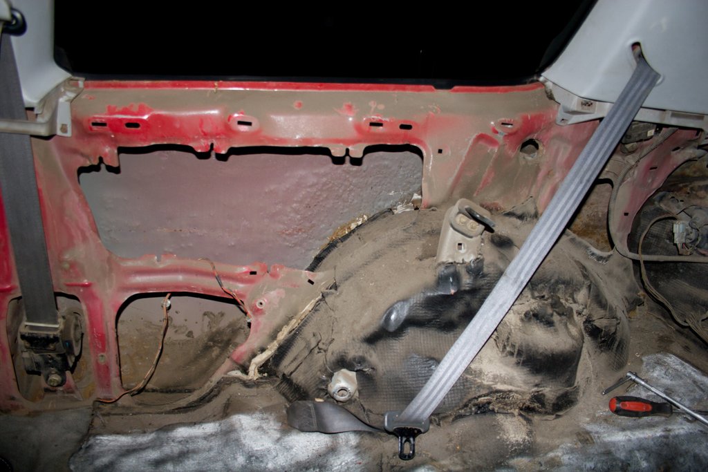 Содрал сегодня остатки покрытия с внешней арки,наковырял там дырок) Буду лечить потихоньку.Зачистил частично до металла швы и ржавчину со стороны багажника.