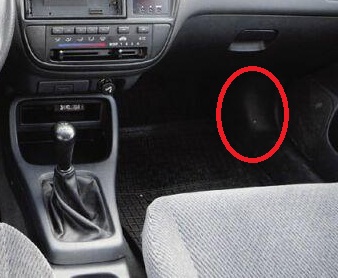 в ногах у пассажира. за пластиковой накладкой.
