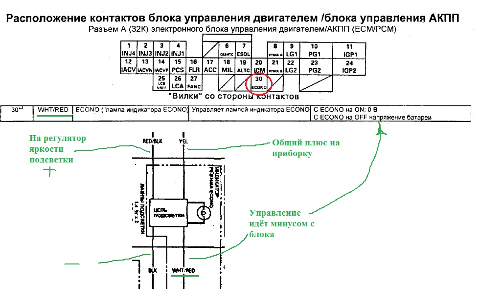 Включи тестер на 20V и повесь один щуп на массу - второй щуп на бело-красный (WHT/RED) провод. Когда Econo должно гореть - будет 0V на приборе, когда не должно - будет 12V.