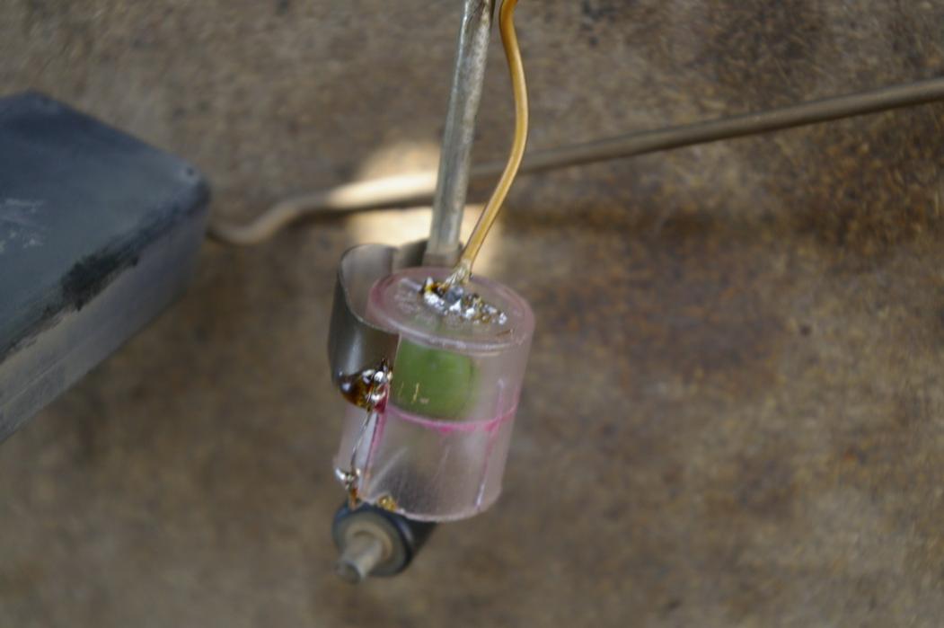 Дальше нам понадобился колпачек от губной помады, разрезанный пополам... с цельной стороны сделал дырку, и снутри запустил терморезистор , и сверху припаял провод, а второй конец - припаял к держателю этой "баночки"(фото №3)