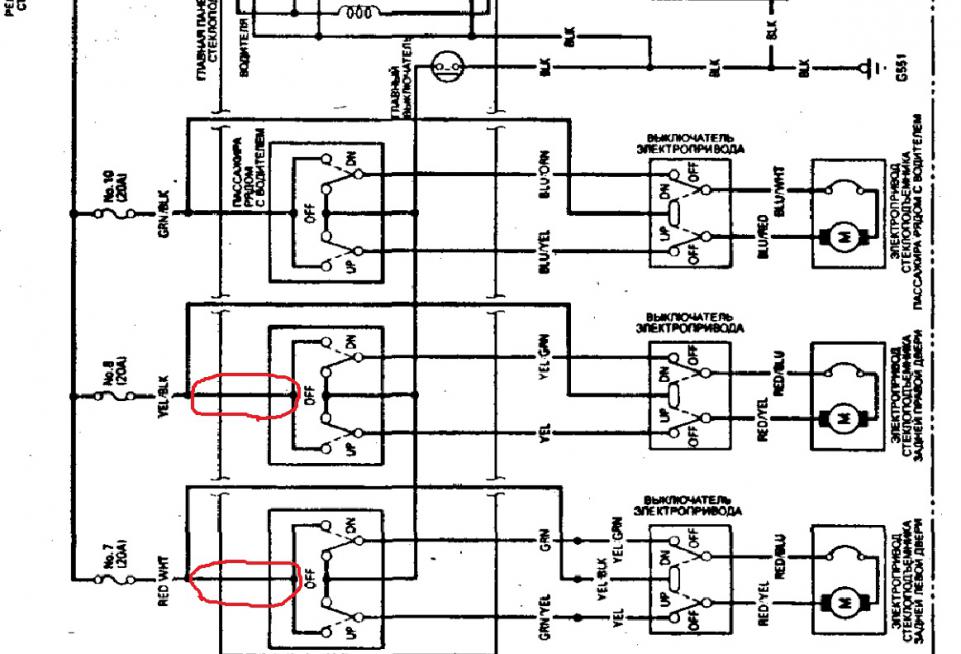 Для проверки померил между остальными, исправно работающими: Red\white-Black (Задний-левый), Yellow\Black-Black(Задний правый), Blue\Black-Black (Водительская дверь) - там напруга была