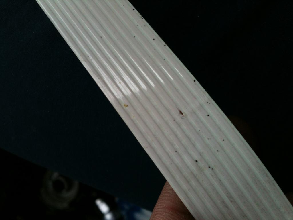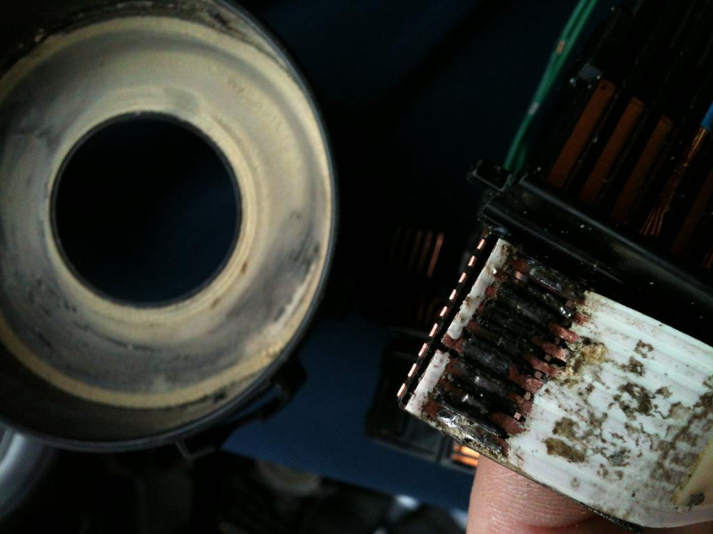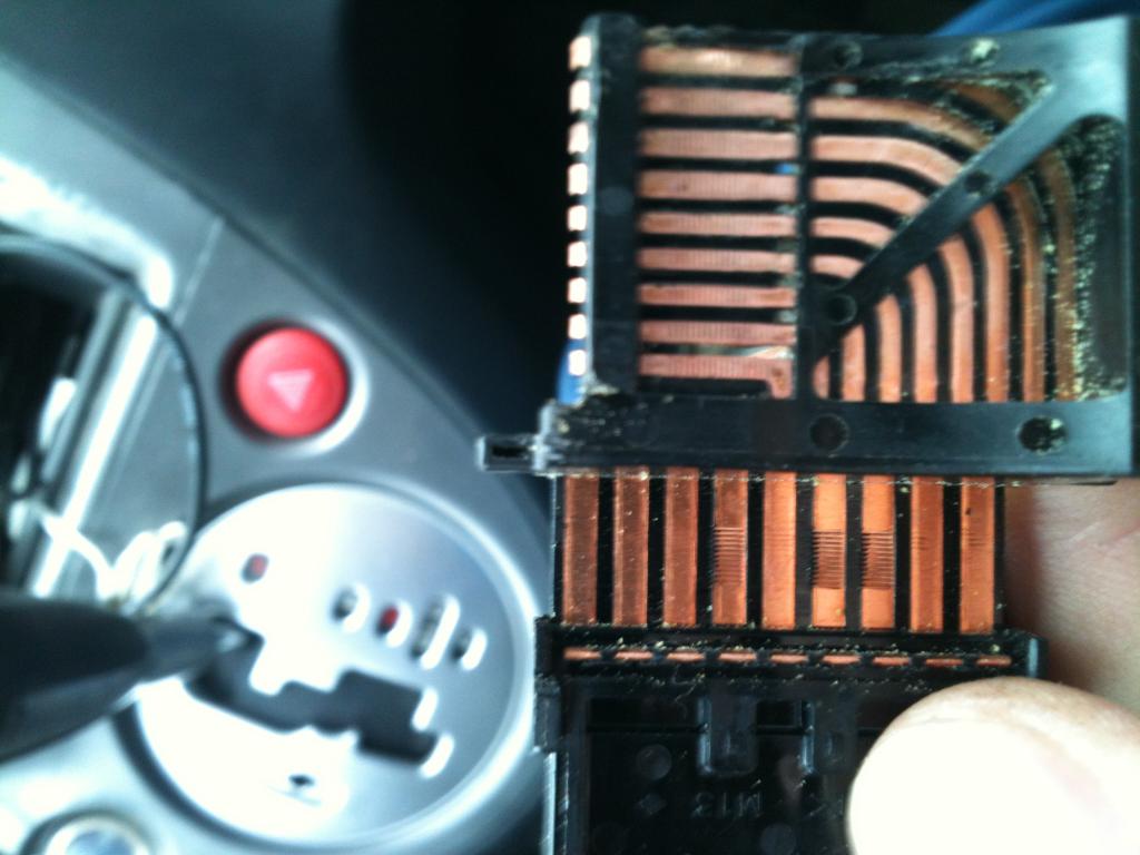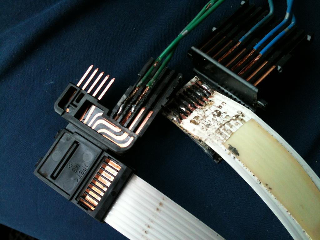 3-й заход. Опять разобрал все, да разобрал все до костей, все контакты, дорожки, пайка и заклепка дорожек, все на виду (см. фото). Просмотрел шлейф с двух сторон, нашел протертость (фото), но она не могла влиять на мою проблему, так как протерлась о пластиковый корпус, потому что находится почти рядом с дорожками разъема. Нашел медный кусочек провода шлейфа под пластиком возле пайки, протер пыль где нашел, еще раз иголкой возле проводов шлейфа 3 и 4 от самого широкого (это те два, которые как раз на подушку идут), клеем замазал протертую дырочку, еще долго смотрел на все это дело и не понимал, в чем может быть проблема, звонил вертел, крутил, проверял пайку на прочность. Решил, что пора собрать и опробовать. Сразу сбросил ошибку, лампочка мигнула 2 раза и потухла, включаю зажигание, жду, завожу, потухла. Кручу в разные стороны рулем не загорается, доехал до дома так и не загорелась...