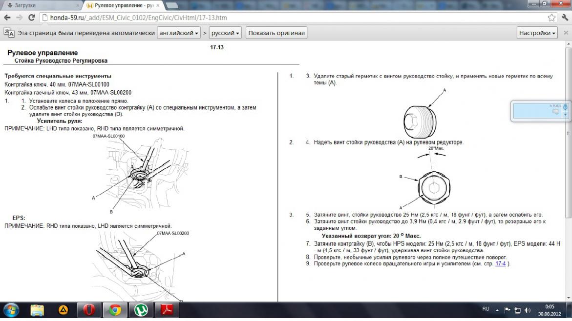 Момент затяга направляющей рулевой рейки (сухаря) 3.9 N.m . затем отвернуть на 7 градусов (Я НЕ ВОЗВРАЩАЮ ) и затянуть контрогайку с моментом 44N.m. Если рейка перетянута то практически обездвижен шток рейки - стук если присутствует то он из редуктора. Если так и осталось в ногах у пассажира стучёк при вращении руля то всё перевтуливание прошло насмарку.