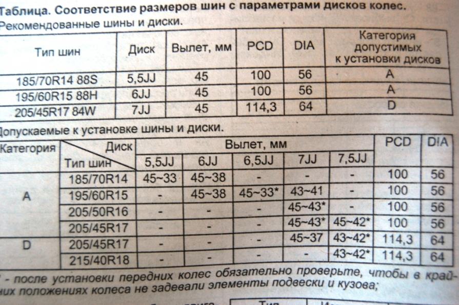 мож кому пригодиться, сфотал таблицу размерности колес и дисков с книжки по 7ым сивкам