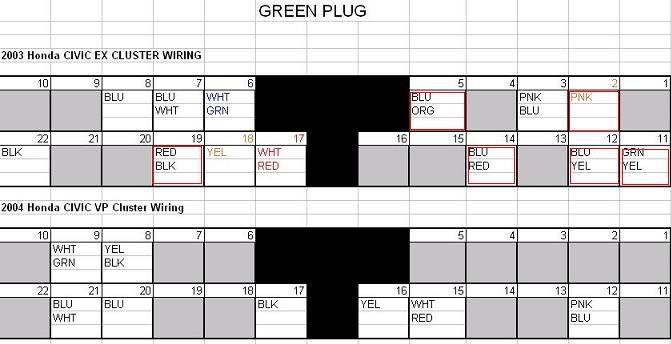 Вообщем заменил я себе приборку, Большое спасибо за все Reader'у . В приложенных фотках моя старая панель и новая с тахометром(точнее не мои приборки а просто фотки с инэта, мои приборки в милях), а так же распиновка синего и зеленого разъема. Я себе менял распиновку по верхним схемам (civic ex cluster). В результате заранее следует запастись одним проводом сантиметров 15-20 для удлиннения одного провода, а так же я у себя в косе не нашел двух проводов для зеленого раъема(один из них точно круиз контроль, а второй хз, но точно от того что не входит в мою комплектацию DX), а так же у меня оказался один лишний бело красный провод.