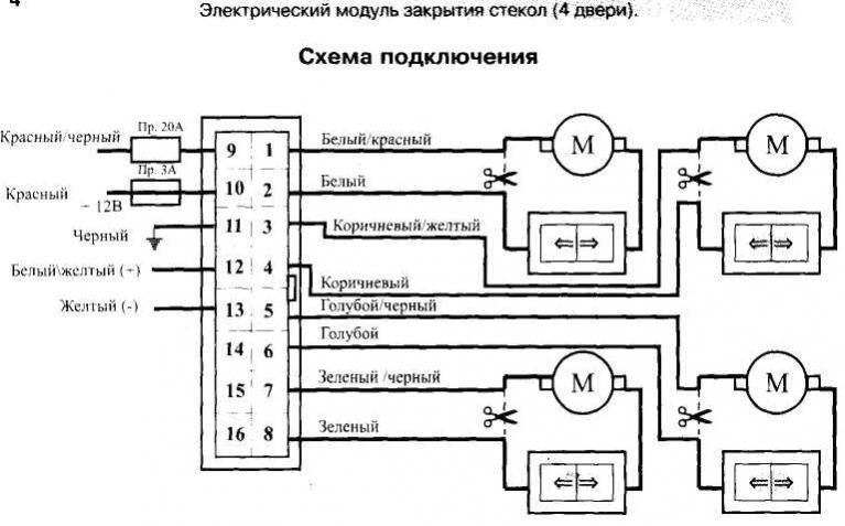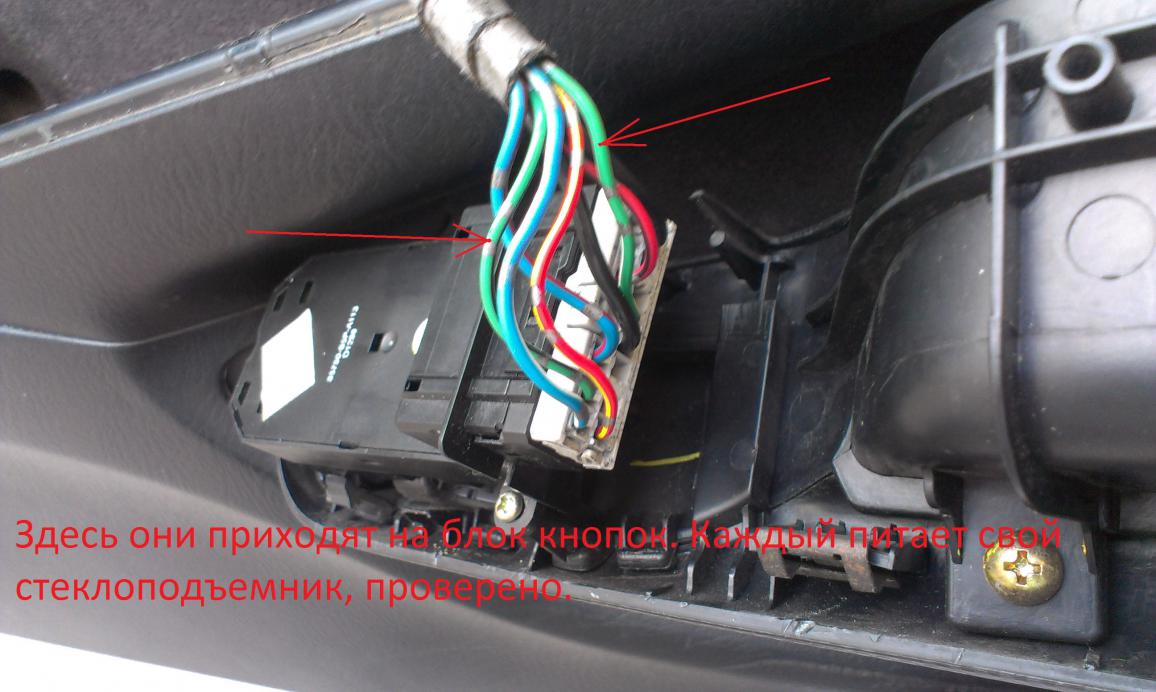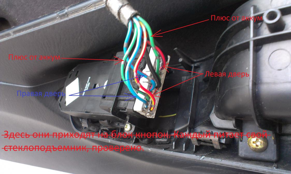 Ради интереса прозвонил провода на кнопках. Получается следующее: синяя пара - пассажирская дверь, красная пара - водительская. При подъеме стекла нам нужен плюс: на водительской он будет на красном с черной полосой, на пассажирской - синий с красной полосой. Есть нюанс - для водительской двери надо заводить пару проводов в дверь. С правой дверью проще - можно сделать у разъема под панелью.
