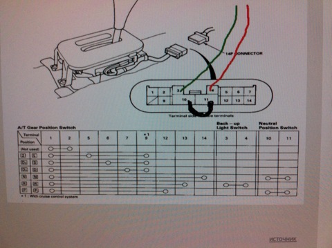 в разьеме в этом соединил так же как на рисунке два черных провода. На 3 и 4 повесил провода, идущие от датчика заднего хода на коробке