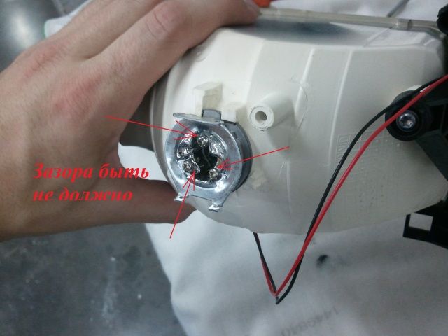 Совочек, у меня к тебе вопрос. С задней стороны линзы на 3 винтика прикручивается скоба, в которую вставляется пружинка для фиксации лампы. Так вот, эта скоба у тебя прилегает к линзе? Основная фиксирующая гайка должна быть закручена достаточно глубоко, чтобы скоба своими усиками легла на поверхность линзы. Если это не так, то лампа не будет находиться в фокусе линзы.