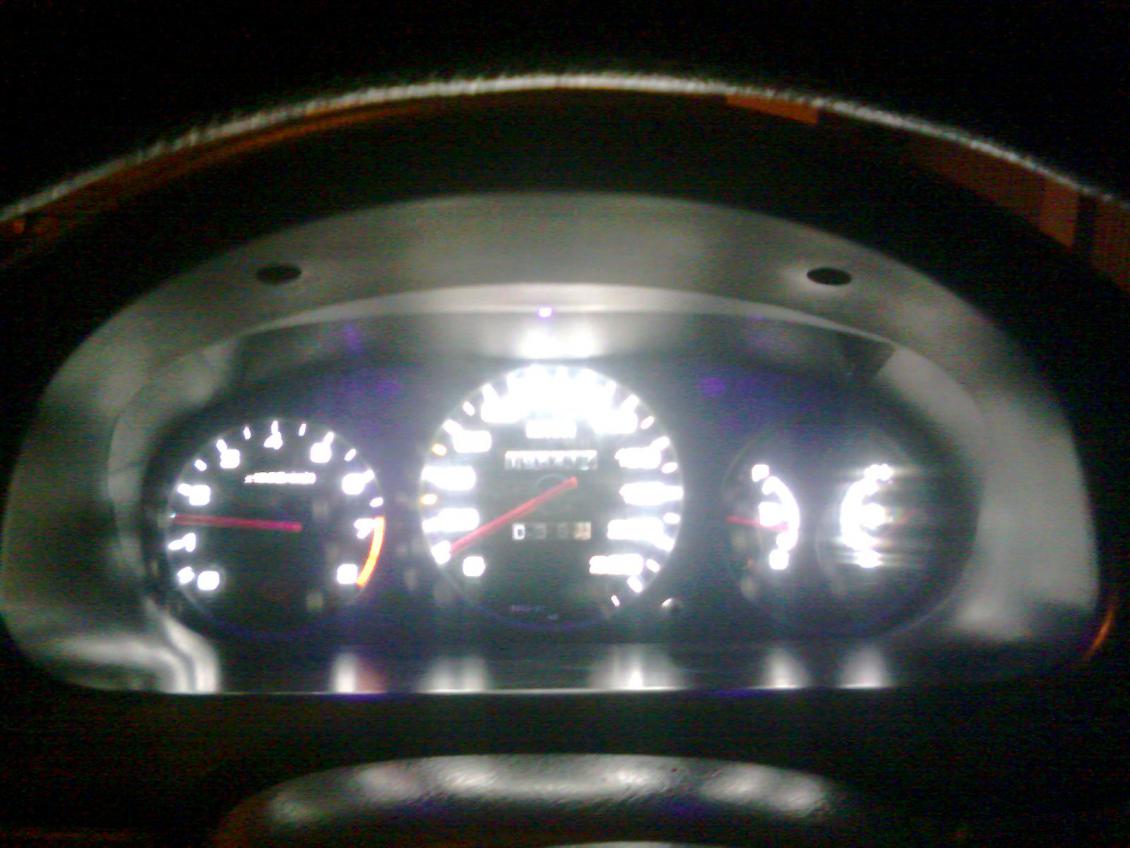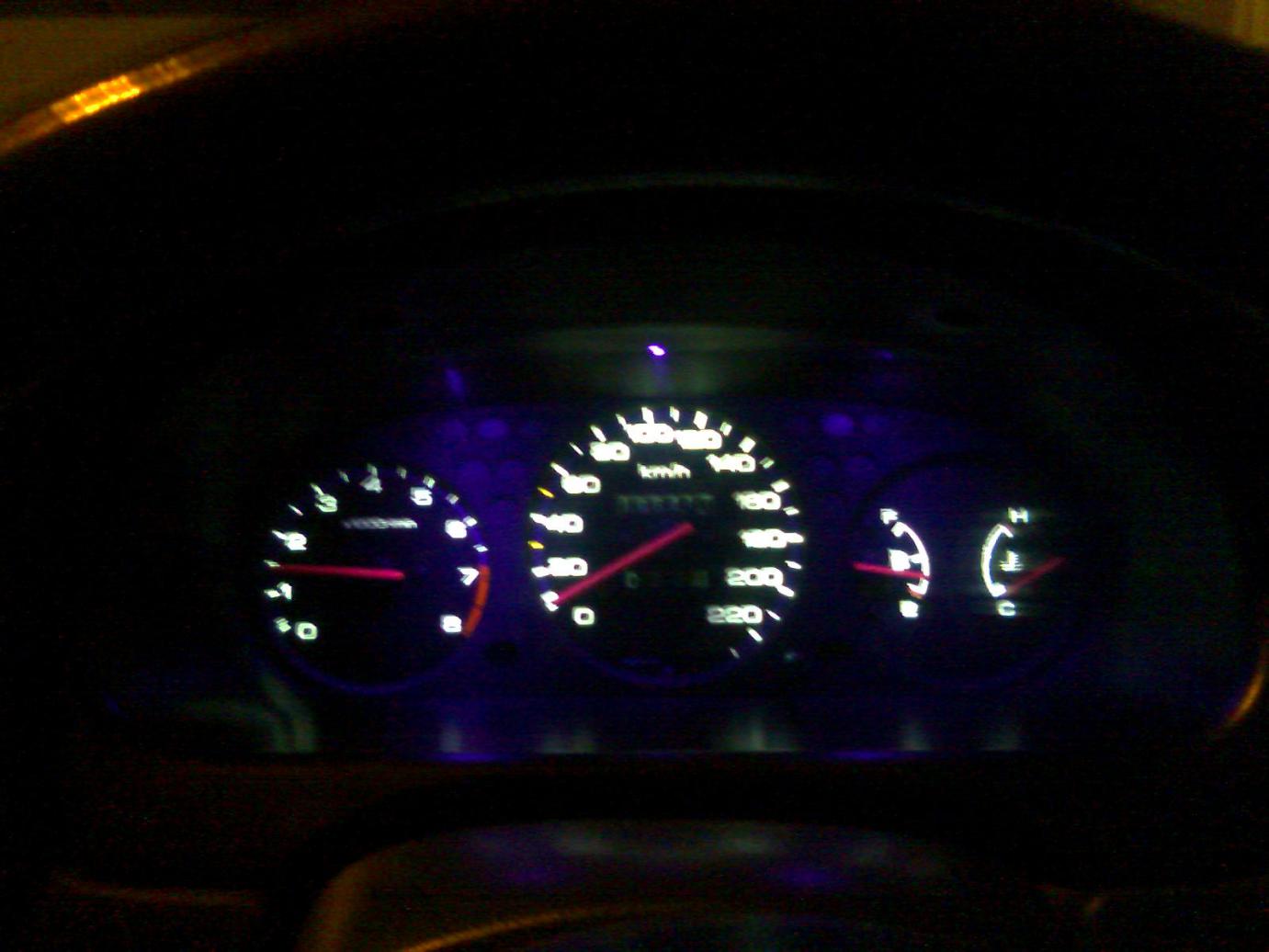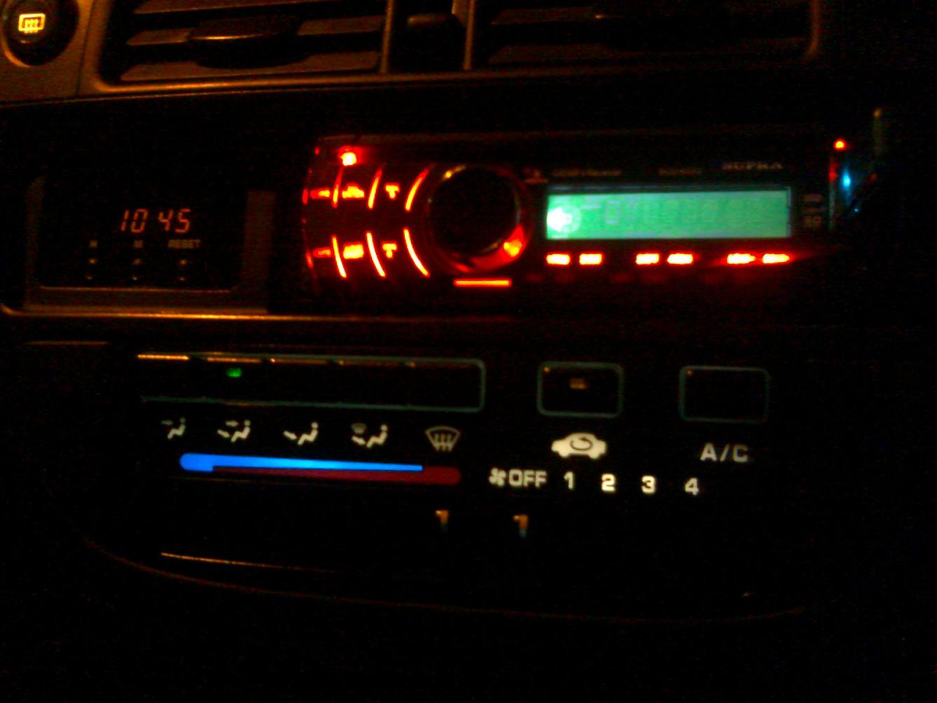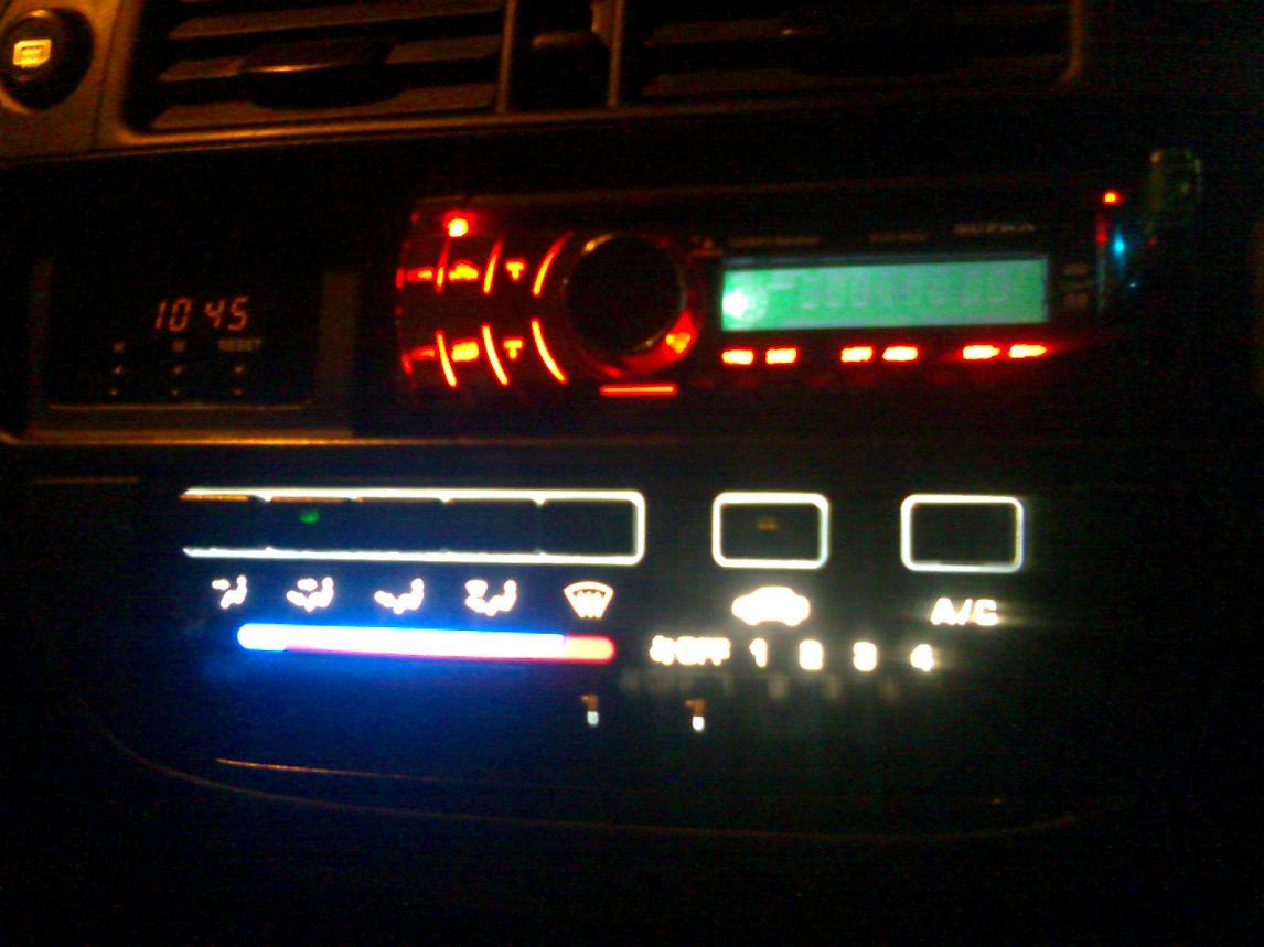 А я вот сделал все таки регулировку яркости)) С лева обычно светят, с права уменьшино. можно ещё немного темнее и вообще без подсветки. только стрелки подсвечивают уф светодиоды))) а упорол это все в кнопку корретора фар, так как все равно просто для красоты в машине стояла)) короче смотрится ооооочень круто в сто раз лучше чем на фото)) Да кстати вот и печка))