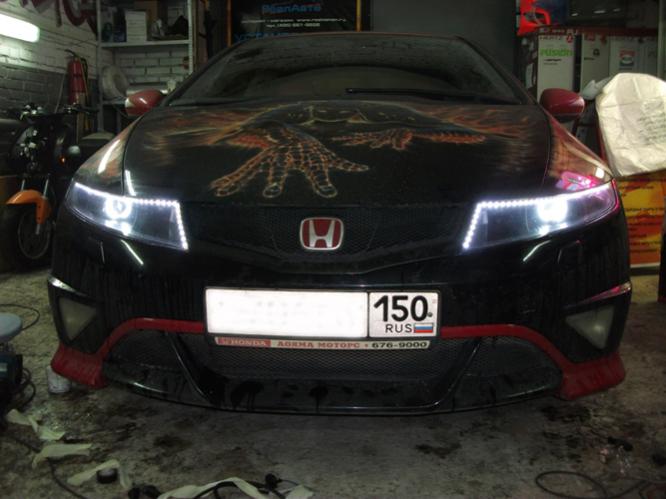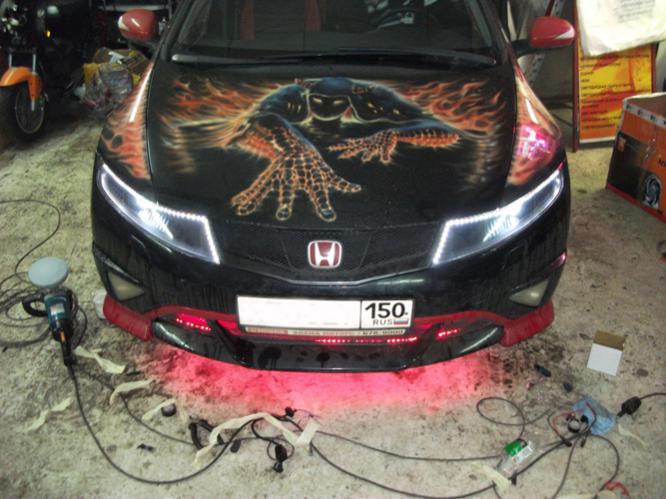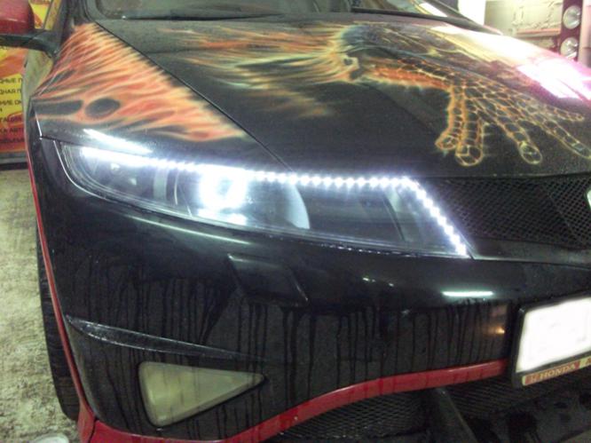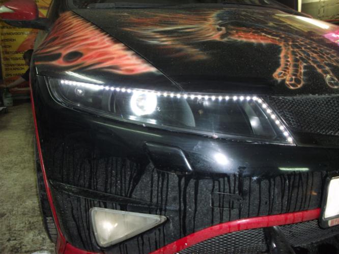 Теперь можно вклеивать стекло фары и подключать светодиодную ленту.