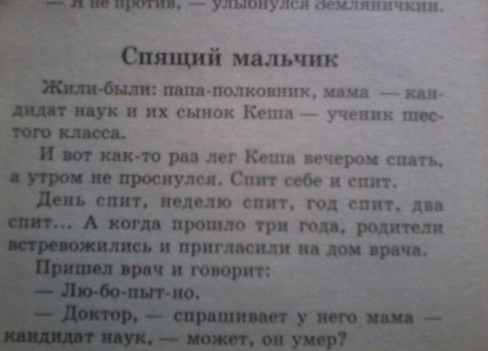 - Во- первых, это не для детей,- отвечает аптекарь,- а, во- вторых, пусть придёт папа и возьмёт нужный размер.